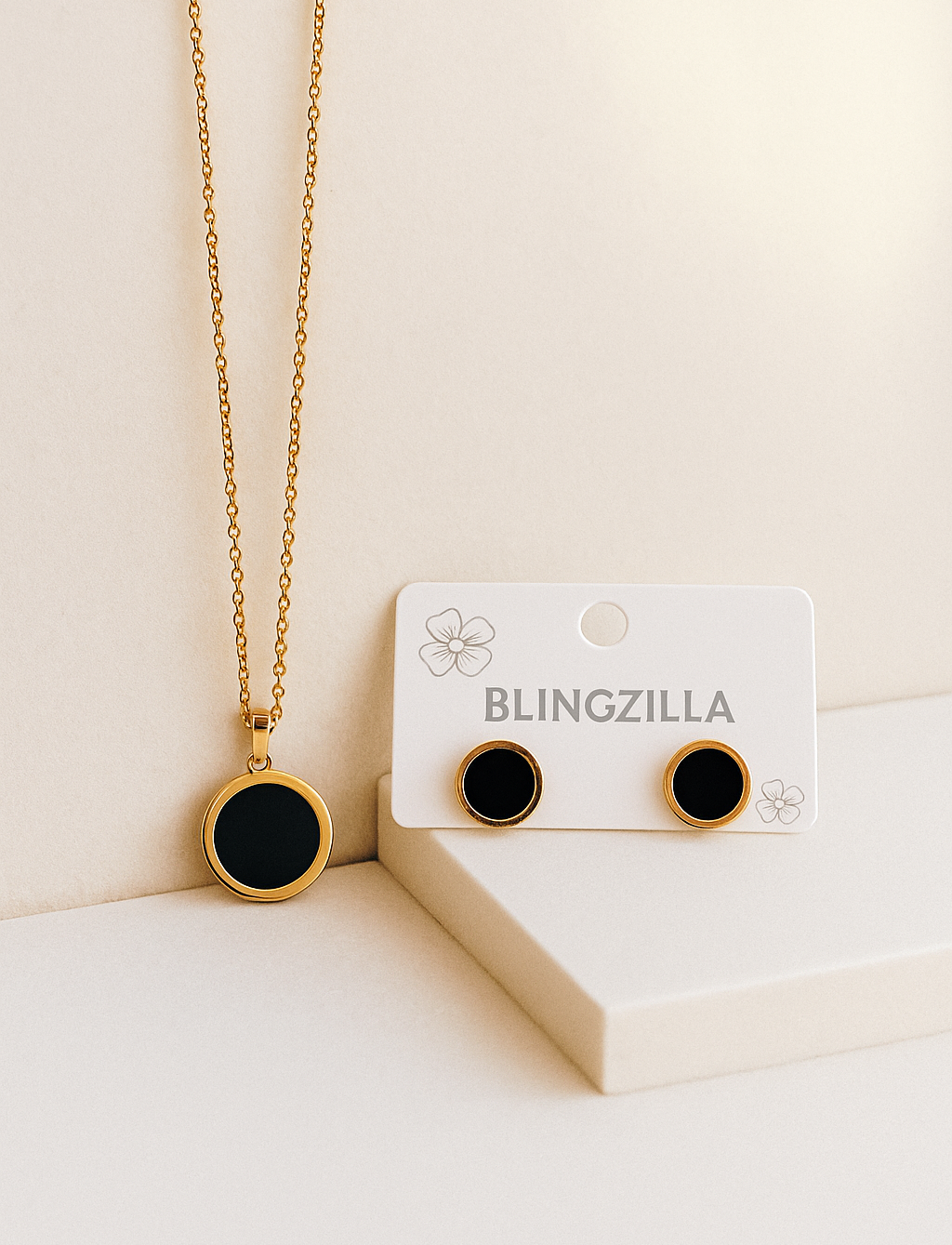 This elegant set combines modern simplicity with timeless luxury. The necklace showcases a smooth, jet-black circular pendant bordered in polished gold, while the matching stud earrings mirror the same striking contrast. Perfect for both everyday wear and special evenings, this versatile duo brings effortless sophistication to any outfit, whether you’re dressing up a casual look or complementing an elegant ensemble.